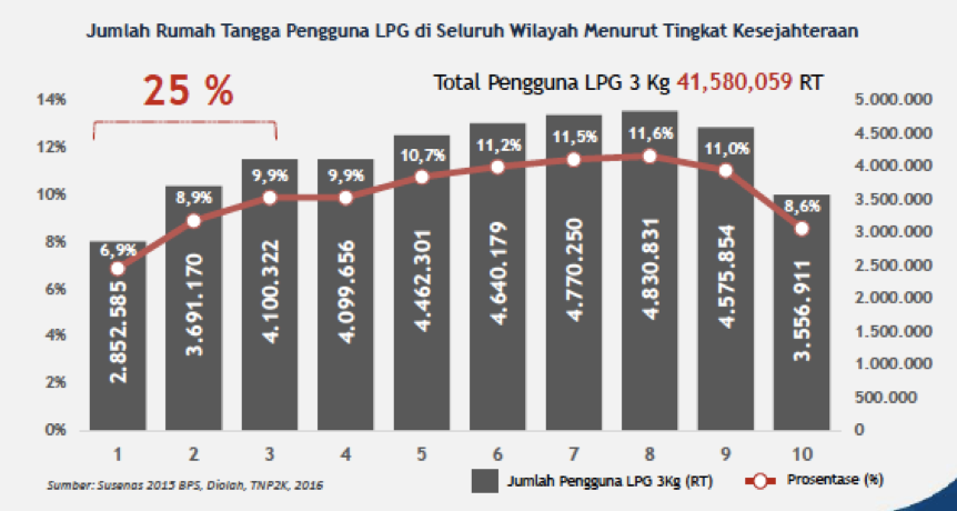 Terlebih lagi, subsidi LPG 3 kg masih dinilai belum tepat sasaran; mayoritas penerima jenis subsidi ini berasal dari kelompok masyarakat menengah ke atas, sedangkan 30% masyarakat termiskin hanya menerima 25% dari total subsidi. Perbaikan akurasi penyaluran subsidi LPG ini berpotensi meningkatkan efisiensi APBN dan menghemat sebesar Rp60 triliun.