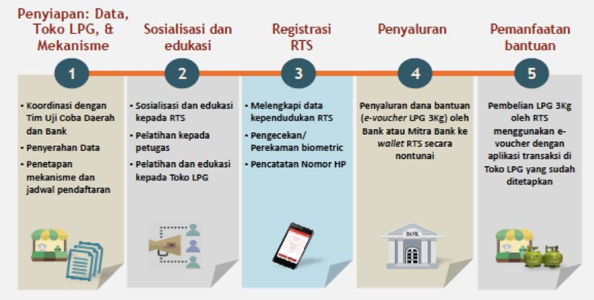 Mengikuti jejak India, pemerintah Indonesia juga sedang melakukan uji coba penyaluran bantuan LPG 3 kg yang memanfaatkan teknologi informasi. Pilot project yang dilaksanakan di tujuh kabupaten/kota ini menggunakan 3 jenis teknologi, yaitu e-voucher berbasis sms, NIK dengan biometrik sidik jari, dan biometrik pengenalan wajah.